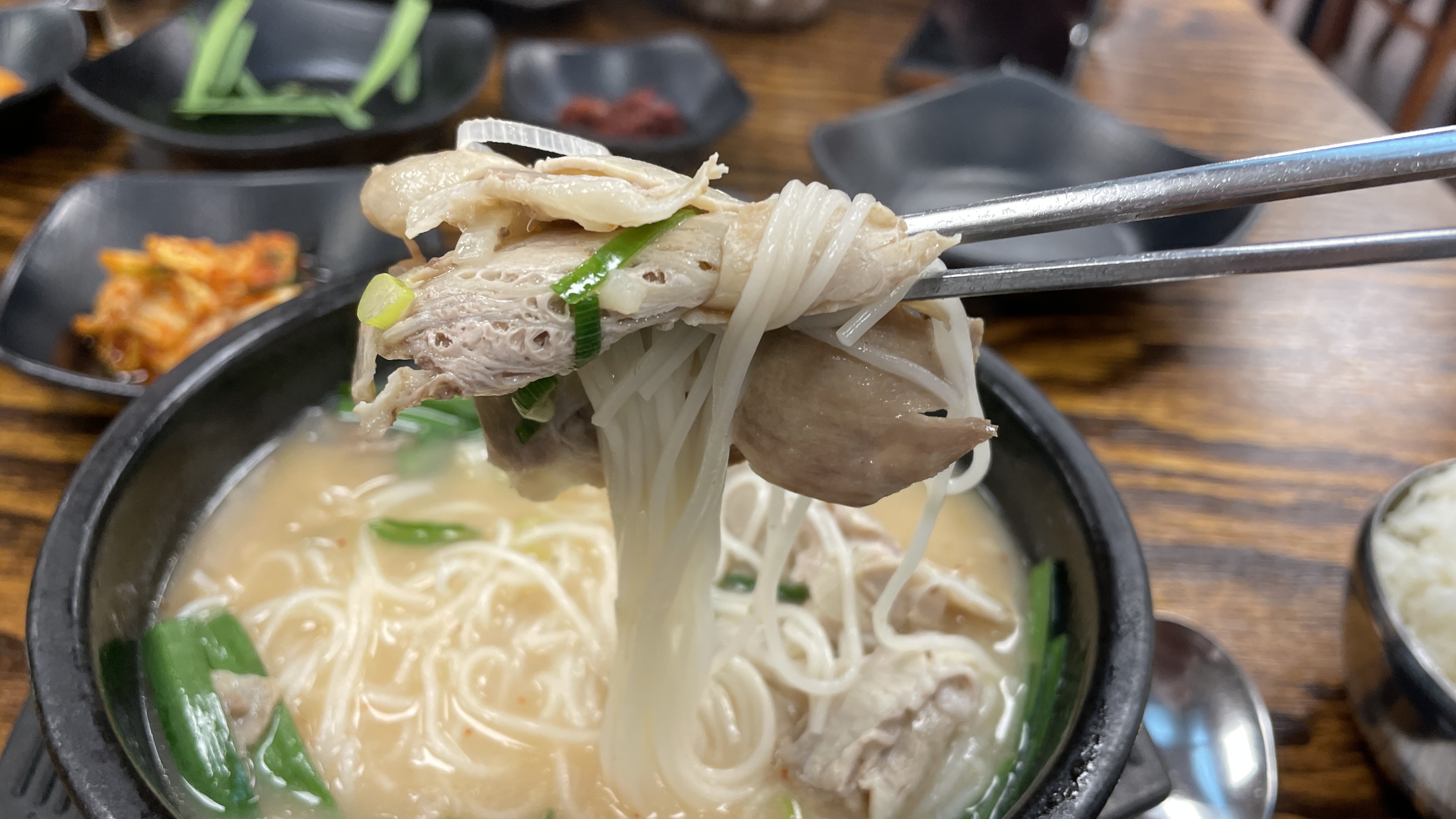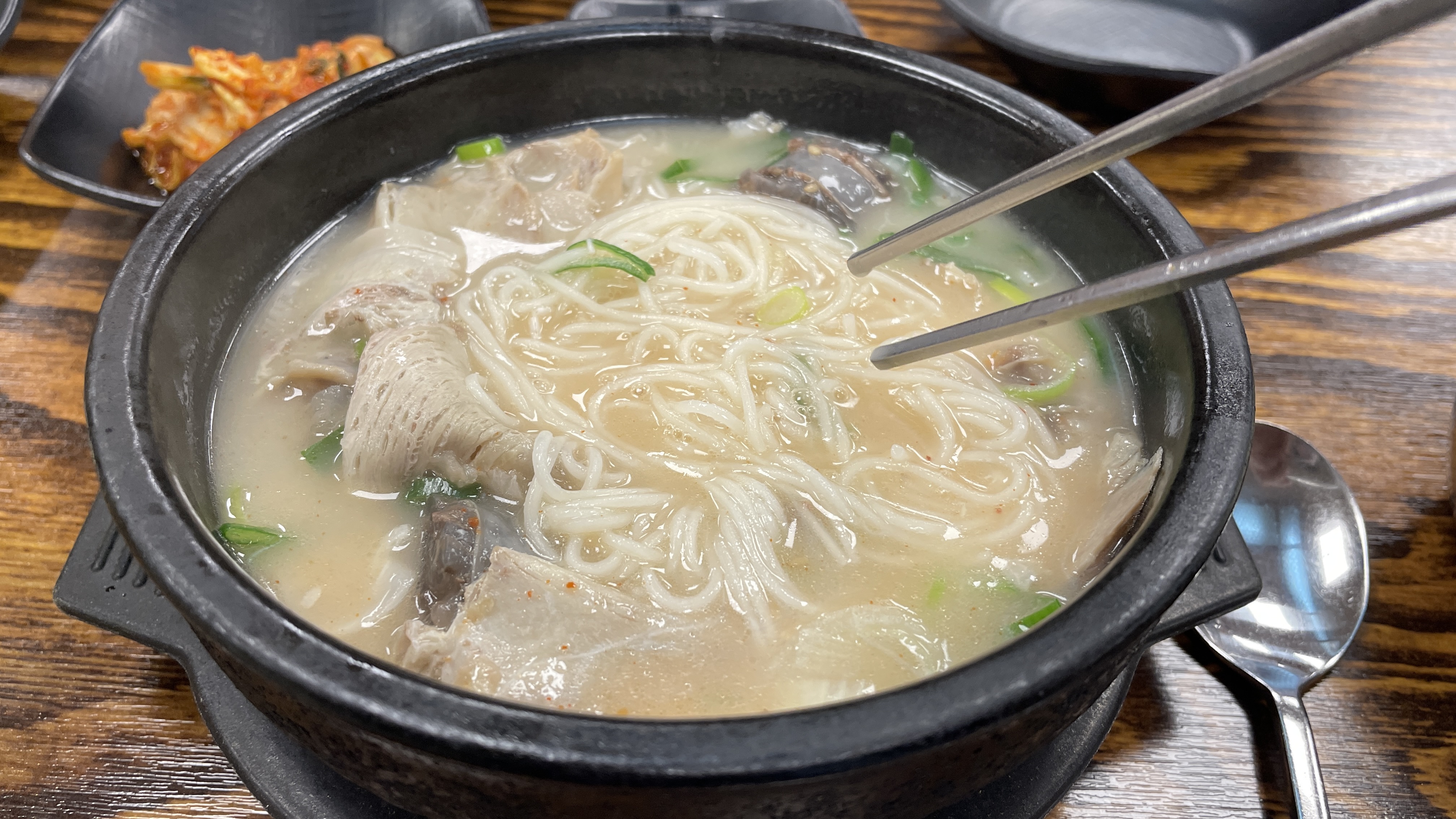 순대국밥에 국수 2개 투입하고 새우젓 넣어서 간을 맞췄습니다.