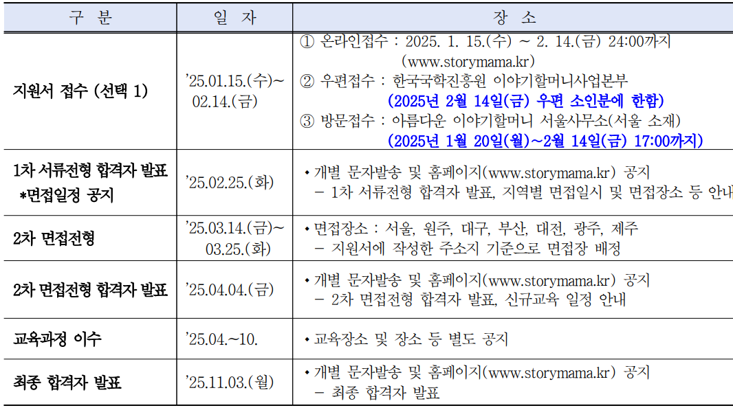 제17기 신규 아름다운 이야기할머니 접수는 2025년 2월 14일 까지 온라인, 우편, 방문 접수 중 한 가지 방법으로 하면 된다.