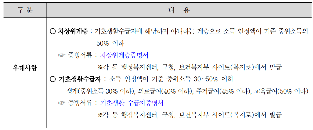 지원자 중 차상위계층 및 기초생활수습자의 경우 선발 심사 시에 가산점을 부여한다.