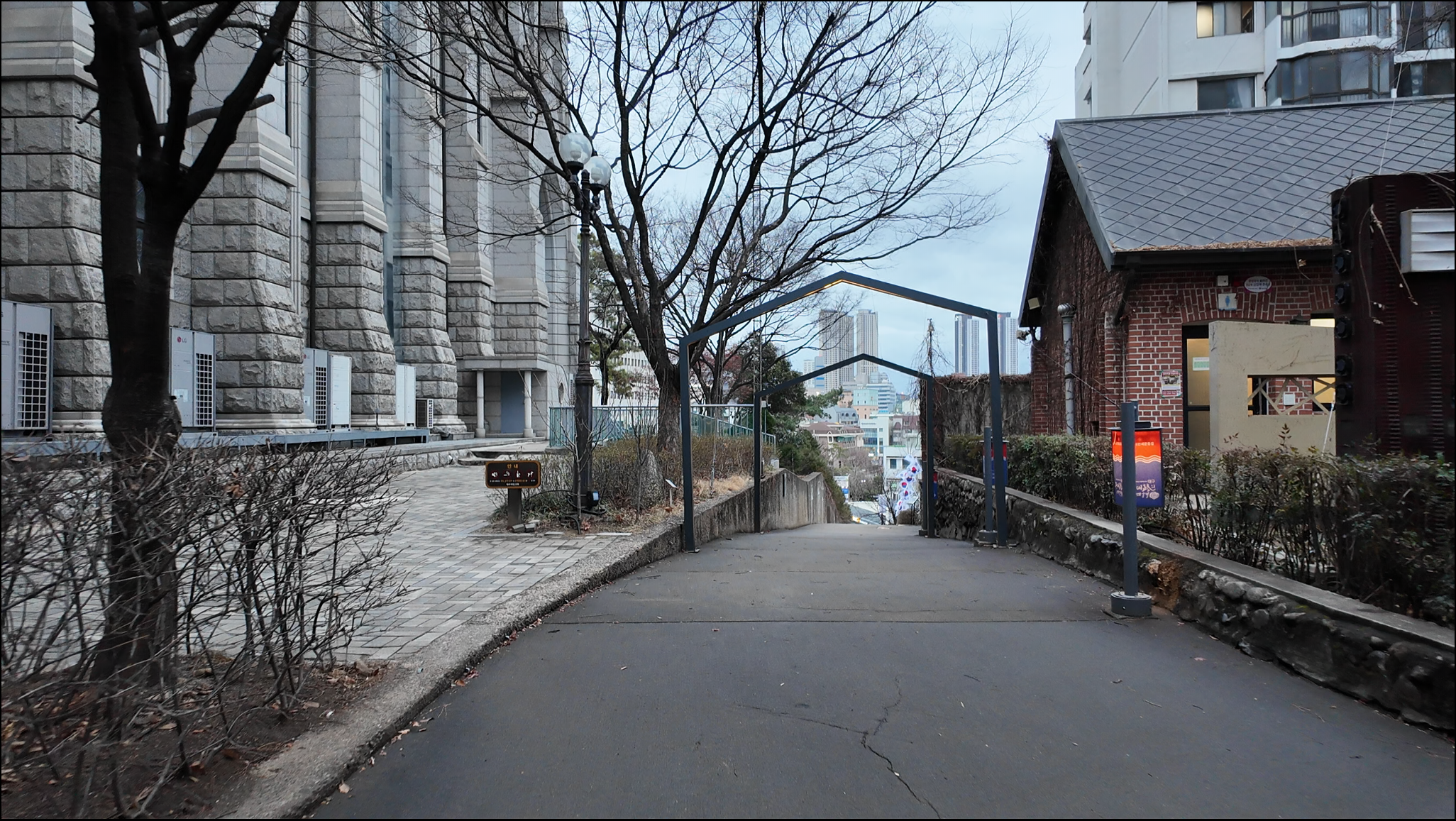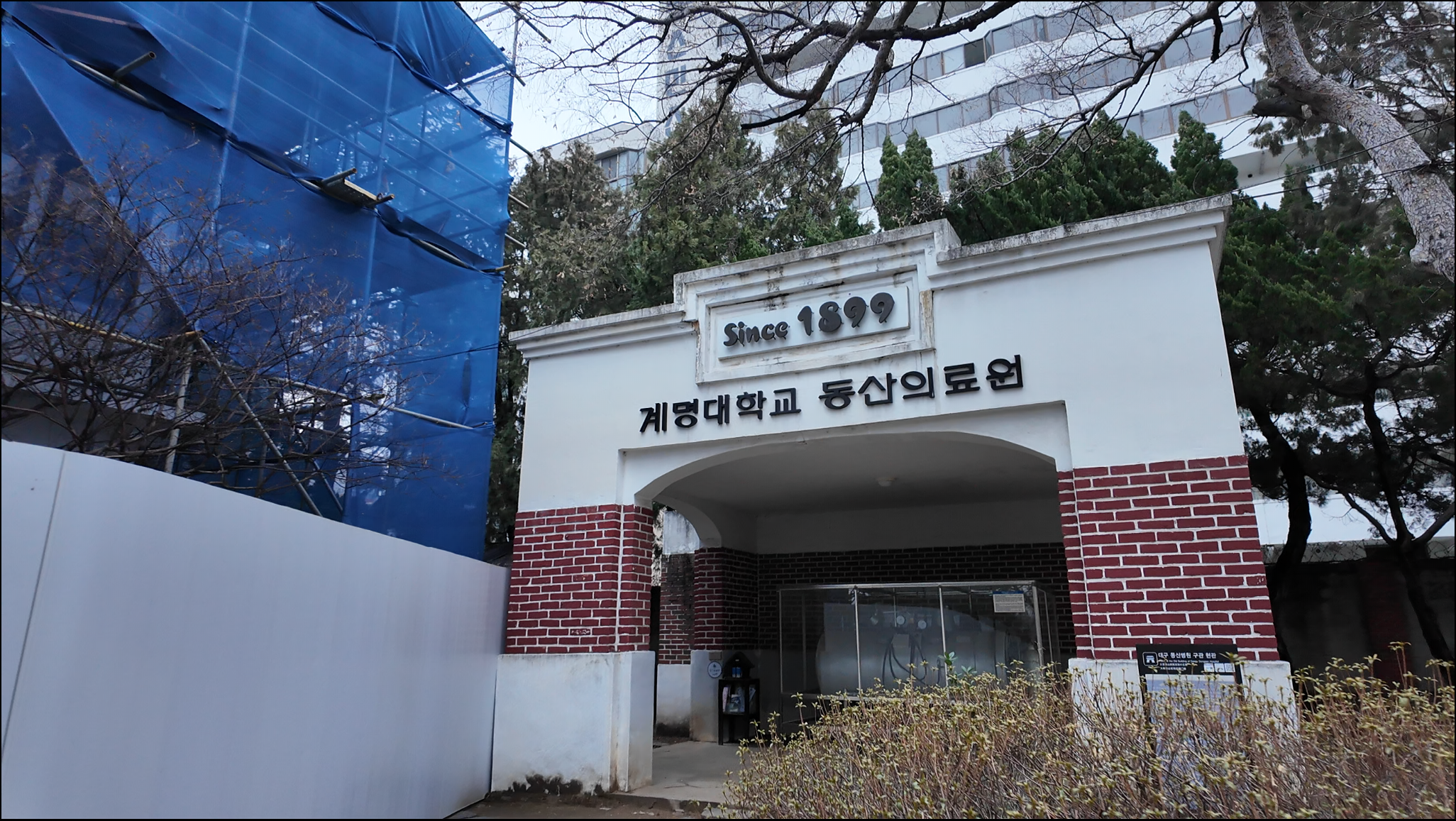 나오면서 보이는 작은 건축물이 있다.바로 동산병원 구관 현관이라는데, 예전에는 어떤 모습이었느지 궁금하다. 언덕 위에 현관이라.......