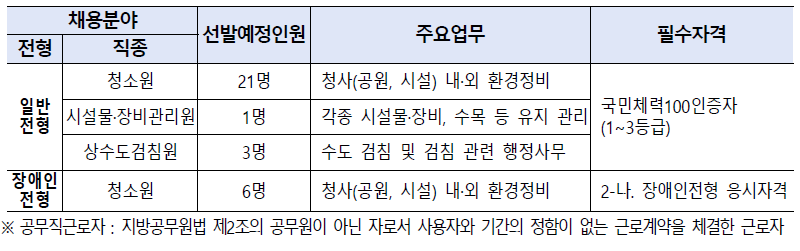 일반전형으로 청소원 21명, 시설물/장비관리원 1명, 상수도검침원 3명, 장애인전형으로 청소원 6명을 채용할 예정이다.