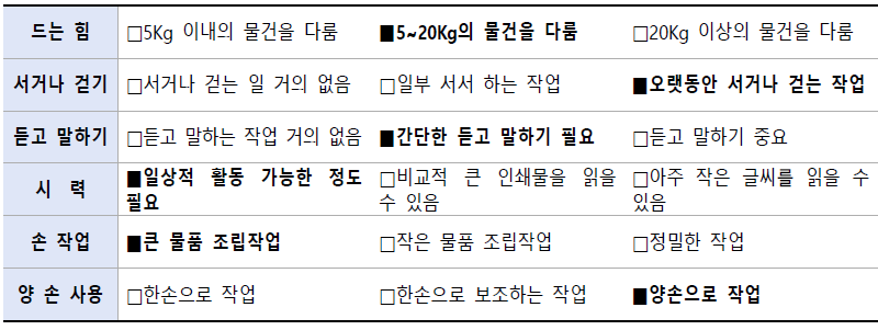 장애인전형(청소원) 작업환경은 5~20kg의 물건을 다룰 수 있고, 오랬동안 서거나 걷는 작업, 간단한 듣고 말하기 필요, 일상적 활동 가능한 정도 필요, 큰 물품 조립작업, 양손으로 작업 등 이다.