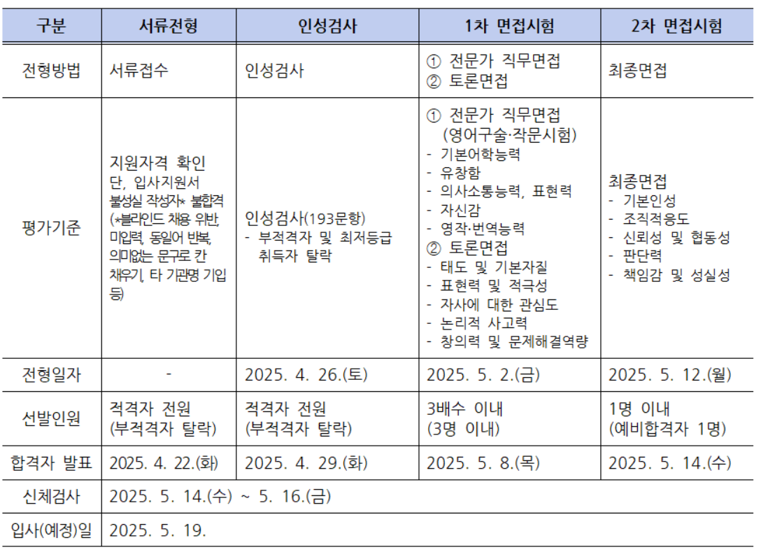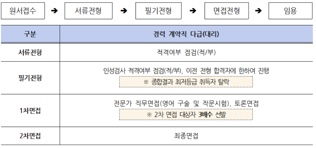 서류전형에서는 적격여부을 확인하고, 필기전형(서류전형 합격자에 한함)에서는 인성검사 적격여부를 점검한다. 1차 면접에서는 전문가 직무면접(영어 구술 및 작문시험), 토론면접을 진행하고 2차면접에서는 최종면접을 진행한다.