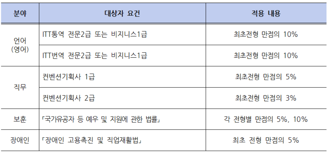 단, 자격증을 중복 보유한 경우 분야별(영어, 직무) 가점이 가장 높은 하나의 자격증만 인정하며 자격증 유효기간이 서류접수 마감일까지 유효한 경우에만 인정하고, 가점은 해당 전형 만점의 배점 외로 추가 가산되며, 지원자가 가산대상에 중복 해당할 경우 최대 10점까지 중복하여 가점 부여한다.