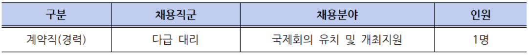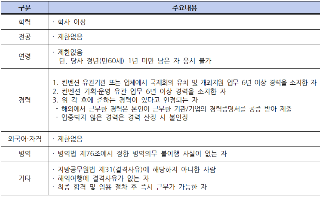 지원 자격은 경력직인 만큼 ① 컨벤션 유관기관 또는 업체에서 국제회의 유치 및 개최지원 업무 6년 이상 경력을 소지한 자 ② 컨벤션 기획·운영 유관 업무 6년 이상 경력을 소지한 자 ③ 위 각 호에 준하는 경력이 있다고 인정되는 자(- 해외에서 근무한 경력은 본인이 근무한 기관/기업의 경력증명서를 공증 받아 제출, - 입증되지 않은 경력은 경력 산정 시 불인정)에 해당하는 경력이 있어야 한다.