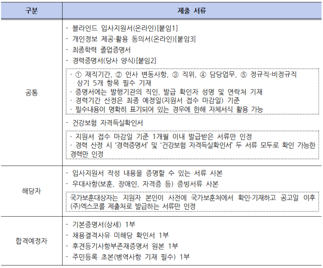 공통적으로 ▶블라인드 입사지원서(온라인)[붙임1] , ▶개인정보 제공·활용 동의서(온라인)[붙임3], ▶최종학력 졸업증명서, ▶경력증명서(당사 양식)[붙임2], ▶건강보험 자격득실확인서 등을 제출해야 하고 해당자의 경우 ▶입사지원서 작성 내용을 증명할 수 있는 서류 사본, ▶우대사항(보훈, 장애인, 자격증 등) 증빙서류 사본을 제출해야 한다.