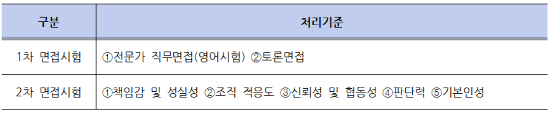 동점자가 발생하는 경우 1차 면접시험에서는 ① 전문가 직무면접(영어시험) ② 토론면접 순으로, 2차 면접시험에서는 ① 책임감 및 성실성 ② 조직 적응도 ③ 신뢰성 및 협동성 ④ 판단력 ⑤ 기본인성 순으로 우선순위를 둔다.