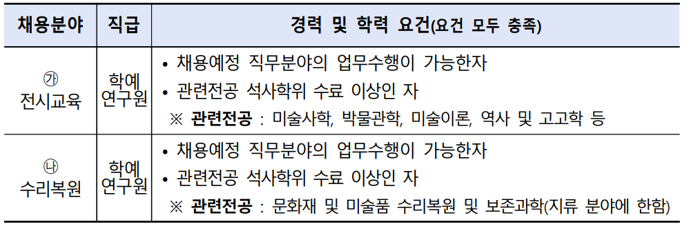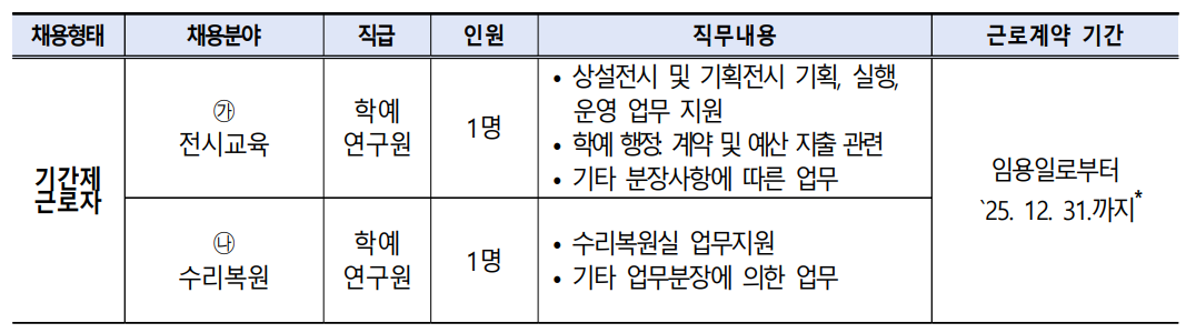 ※ 채용분야 ㉮·㉯ 모두 정규직 전환 없이 근로계약이 종료됨 - ㉮ 분야의 경우 최초 계약기간 8개월이며, 미술관의 사업계획 및 경영여건을 종합적으로 고려하여 1회에 한하여 최대 1년간 연장할 수 있습니다. 총 근로계약 기간은 2026년 12월 31일을 초과할 수 없음.