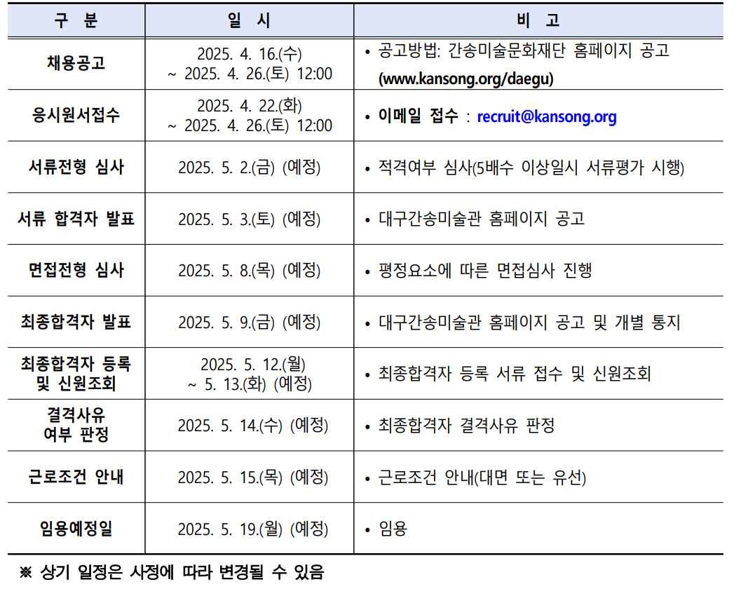 이상의 내용은 대구간송미술관 채용에 대한 주요사항을 요약한 것으로 자세한 사항은 첨부된 공고문을 통해서 확인 가능하다.
