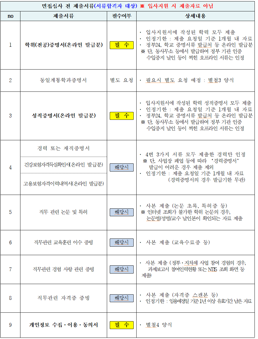 서류전형 합격자의 경우 면접심사 전 학위(전공)증명서(온라인 발급분) 등 서류를 갖추어 제출해야 한다.