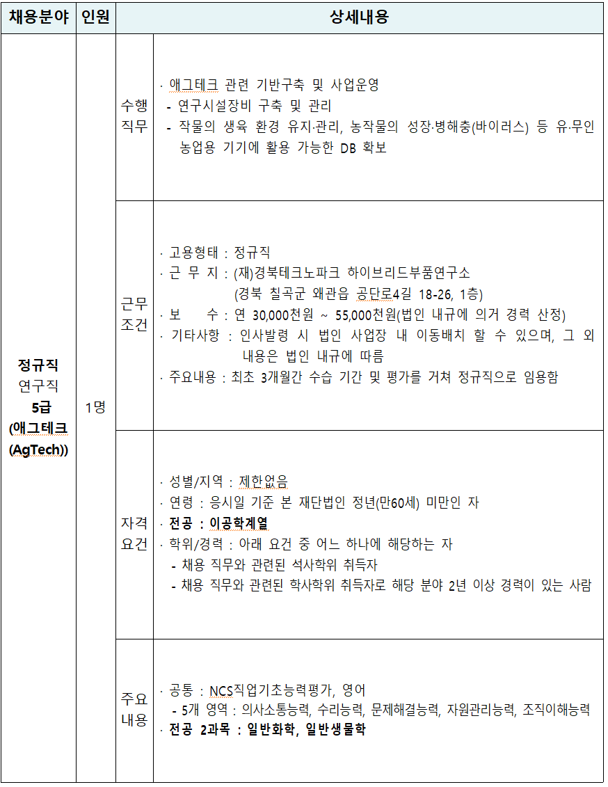 연구직 5급(정규직, 애그테크)는 애그테크 관련 기반 구축 및 사업운영을 담당하며, 경북테크노파크 하이브리드 부품연구소(경북 칠곡군 왜관읍)에서 근무하게 된다. (연봉 30,000천원 ~ 55,000천원)