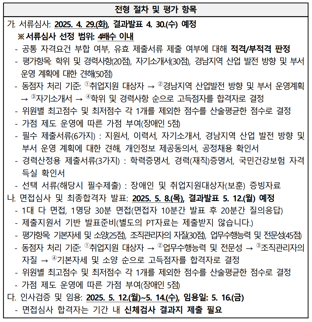 적용되는 평가항목은 학위 및 경력사항(20점), 자기소개서(30점), 경남지역 산업 발전 방향 및 부서 운영 계획에 대한 견해(50점) 등이고 동점자가 발행하는 경우 ①취업지원 대상자 → ②경남지역 산업발전 방향 및 부서 운영계획 → ③자기소개서 → ④학위 및 경력사항 순으로 고득점자를 합격자로 결정한다.