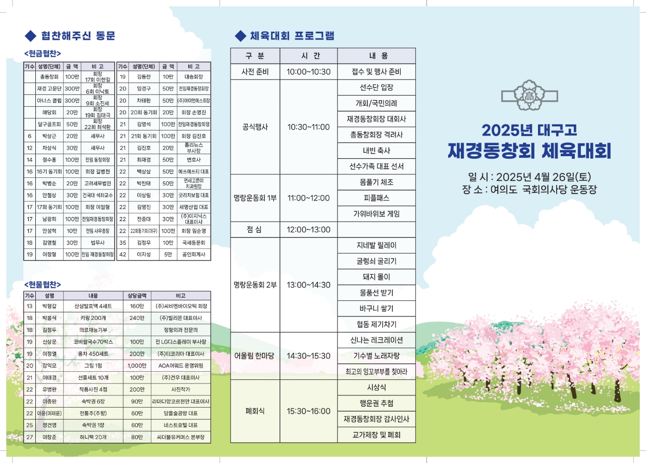 대구고등학교 재경동창회에서 주최한 체육대회는 재경동창회의 큰 행사 중 하나로 여러 동문님들의 후원과 협찬으로 매년 봄에 개최되고 있습니다. 2025년 체육대회에서도 여러 동문님들의 적극적은 협조로 푸짐한 선물과 프로그램이 준비 되었습니다.