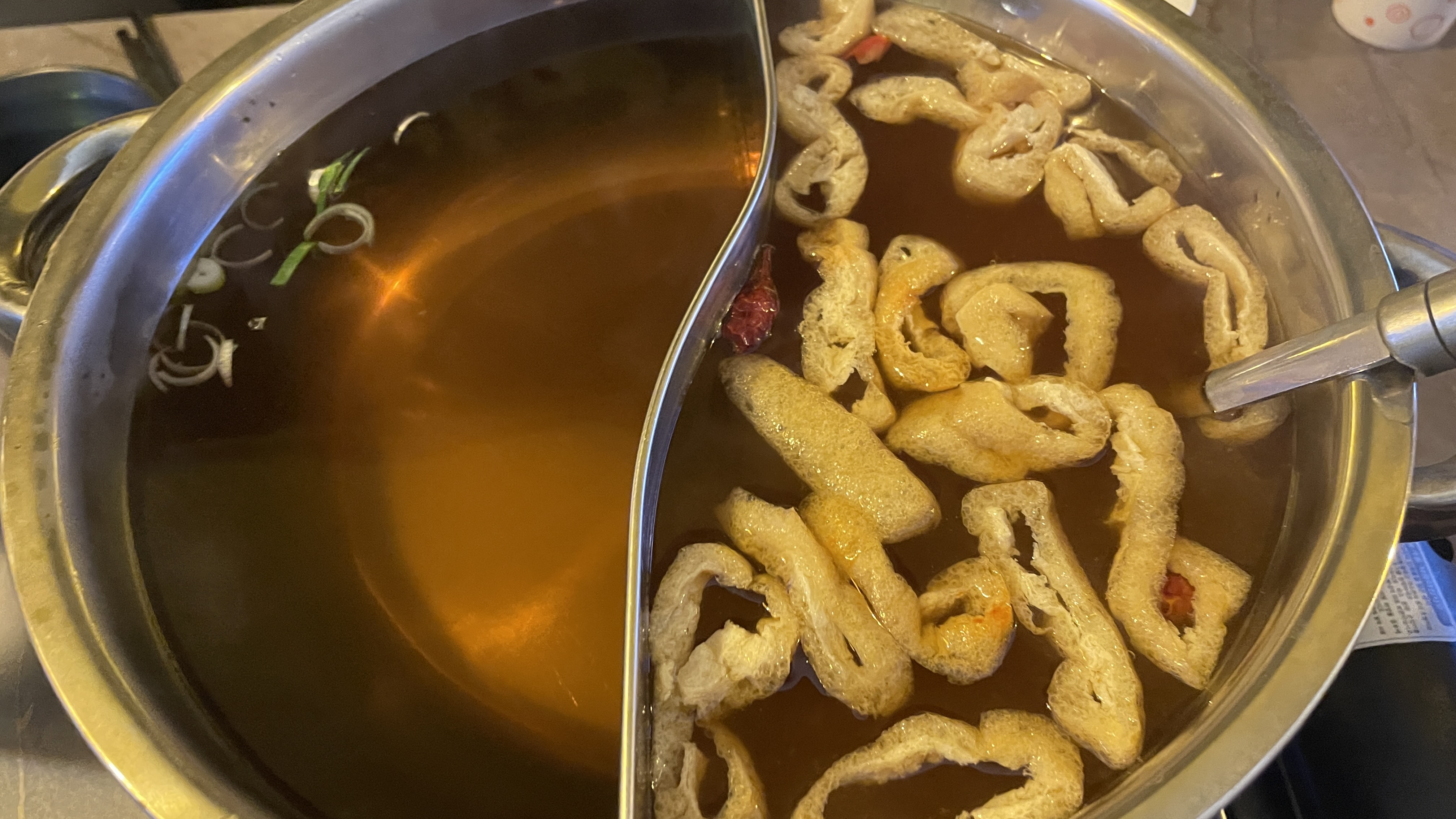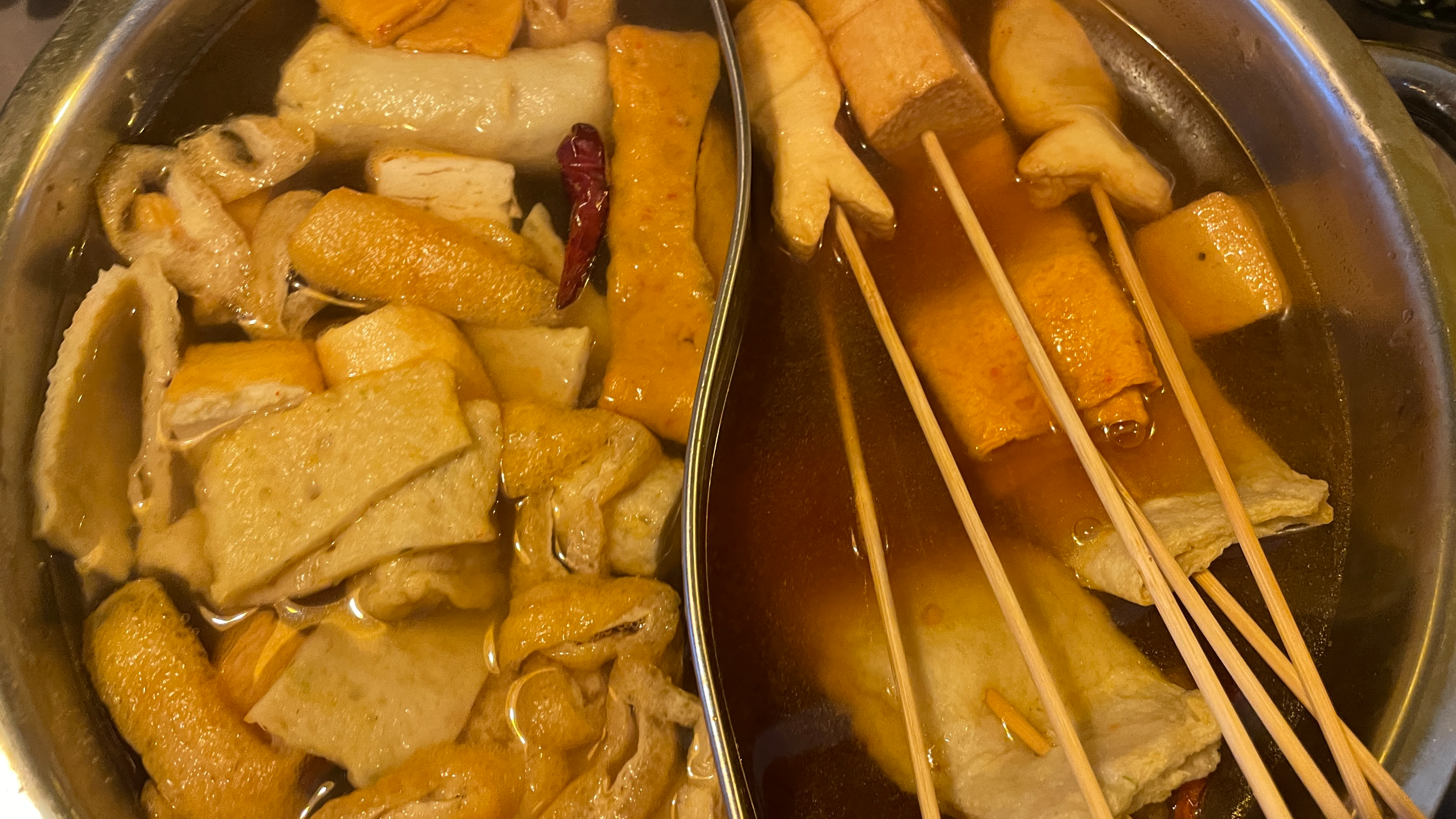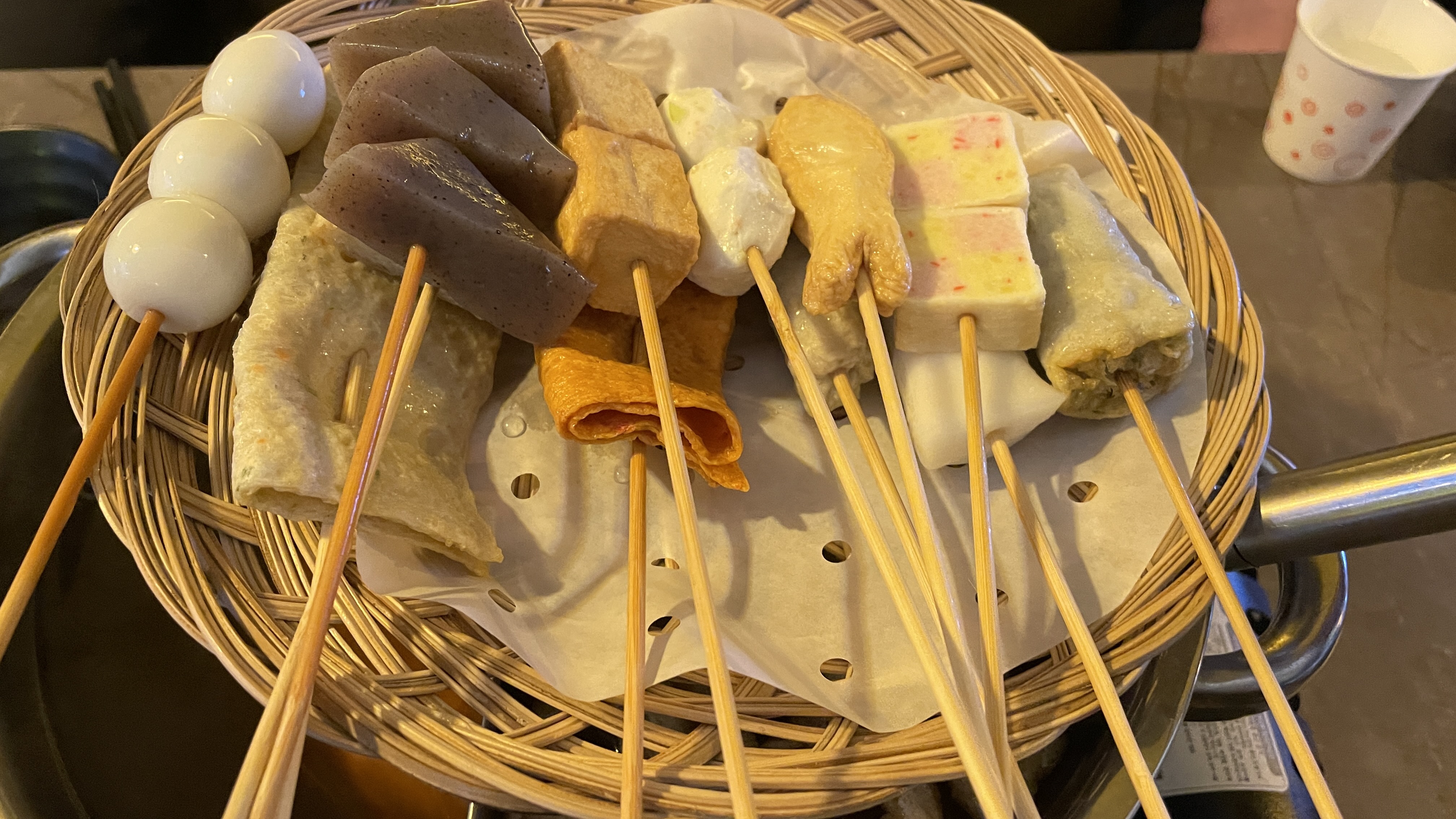 육수가 앞에 놓였고, 어묵이 꼬치로 나왔다.
