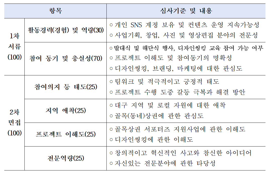1차서류심사에서는 활동경력(경험) 및 역량(30), 참여 동기 및 충실성(70)로, 1차 면점심사에서는 참여의지 등 태도(25), 지역 애착(25), 프로젝트 이해도(25), 전문역량(25) 등을 기준으로 선발한다.
