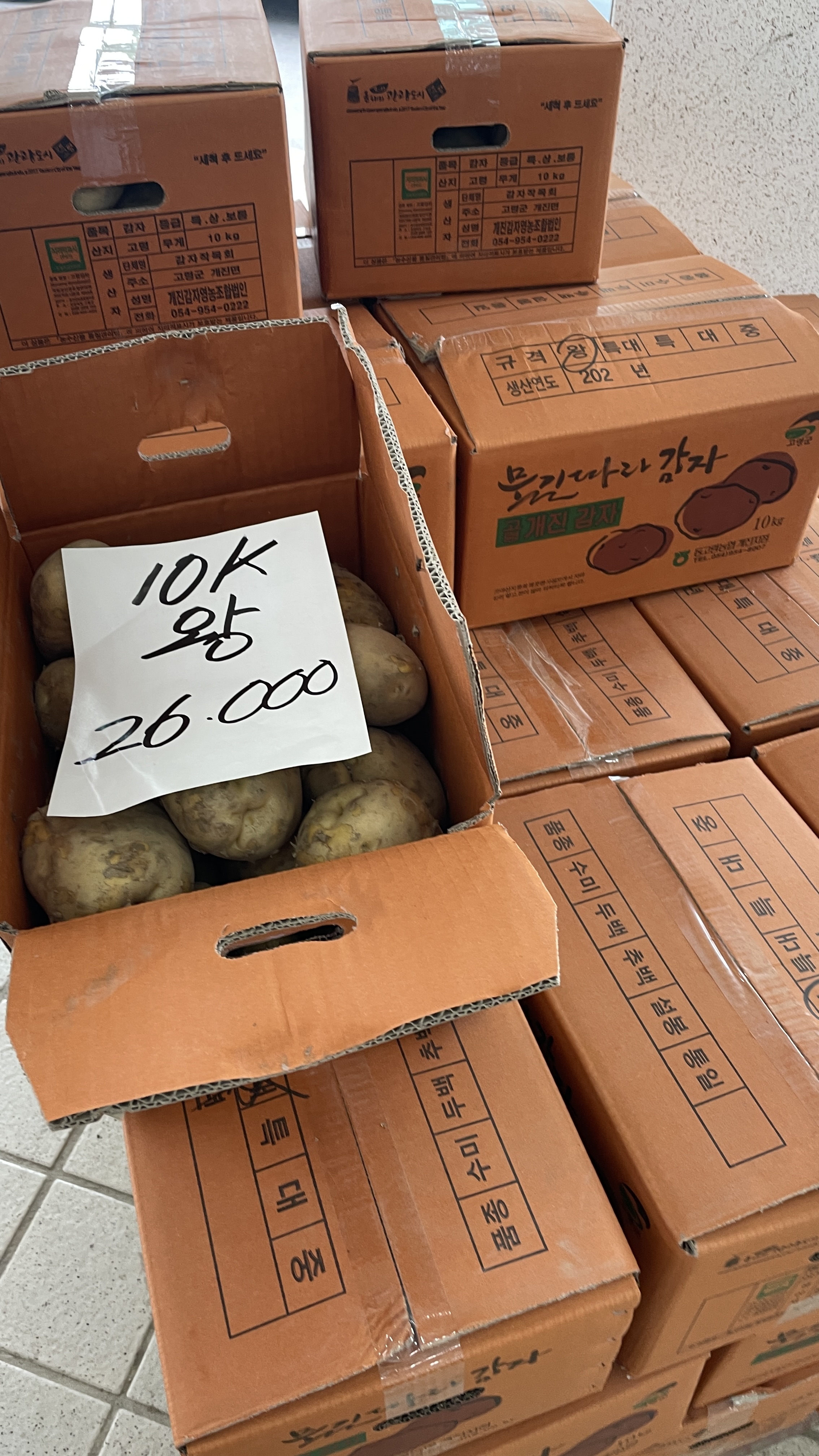 감자 크기별로 박스에 담겨져 있는데요 이 중에서 구매하고 싶은 크기를 선택한 다음 계산하고 자동차로 옮기면 됩니다. 옮기는 것도 개진감자직판장에서 도와주시니 어려움이 없습니다.