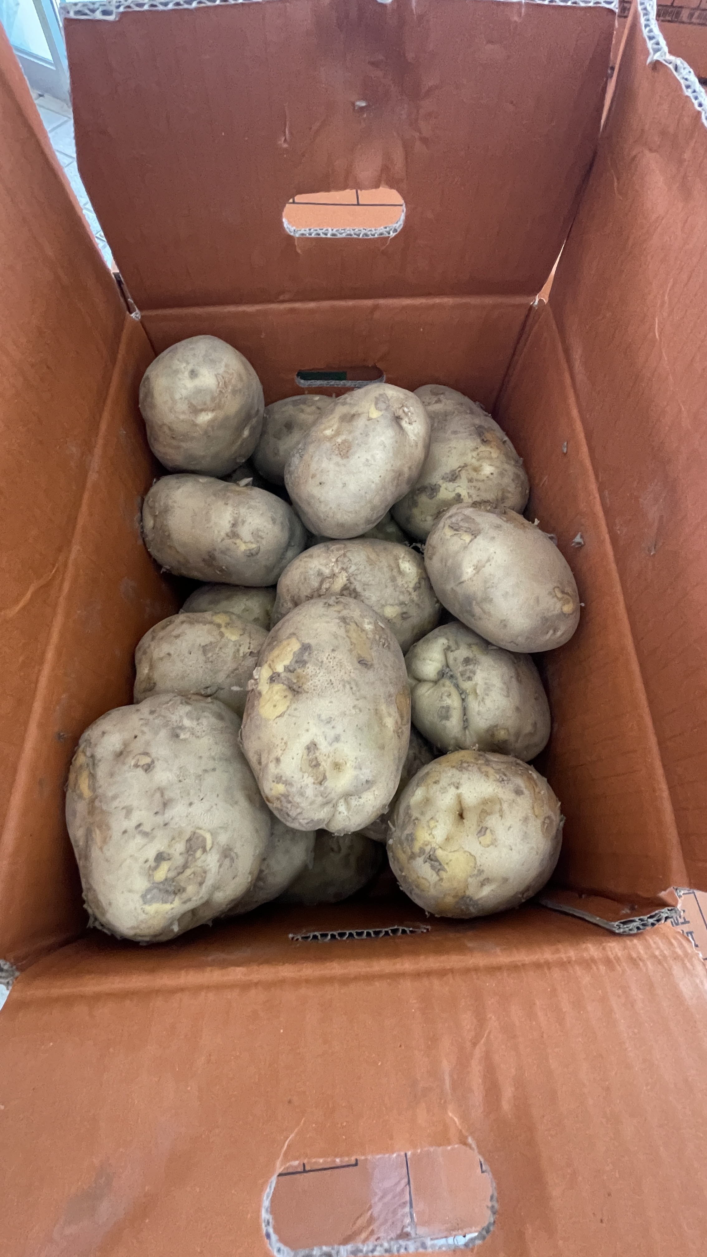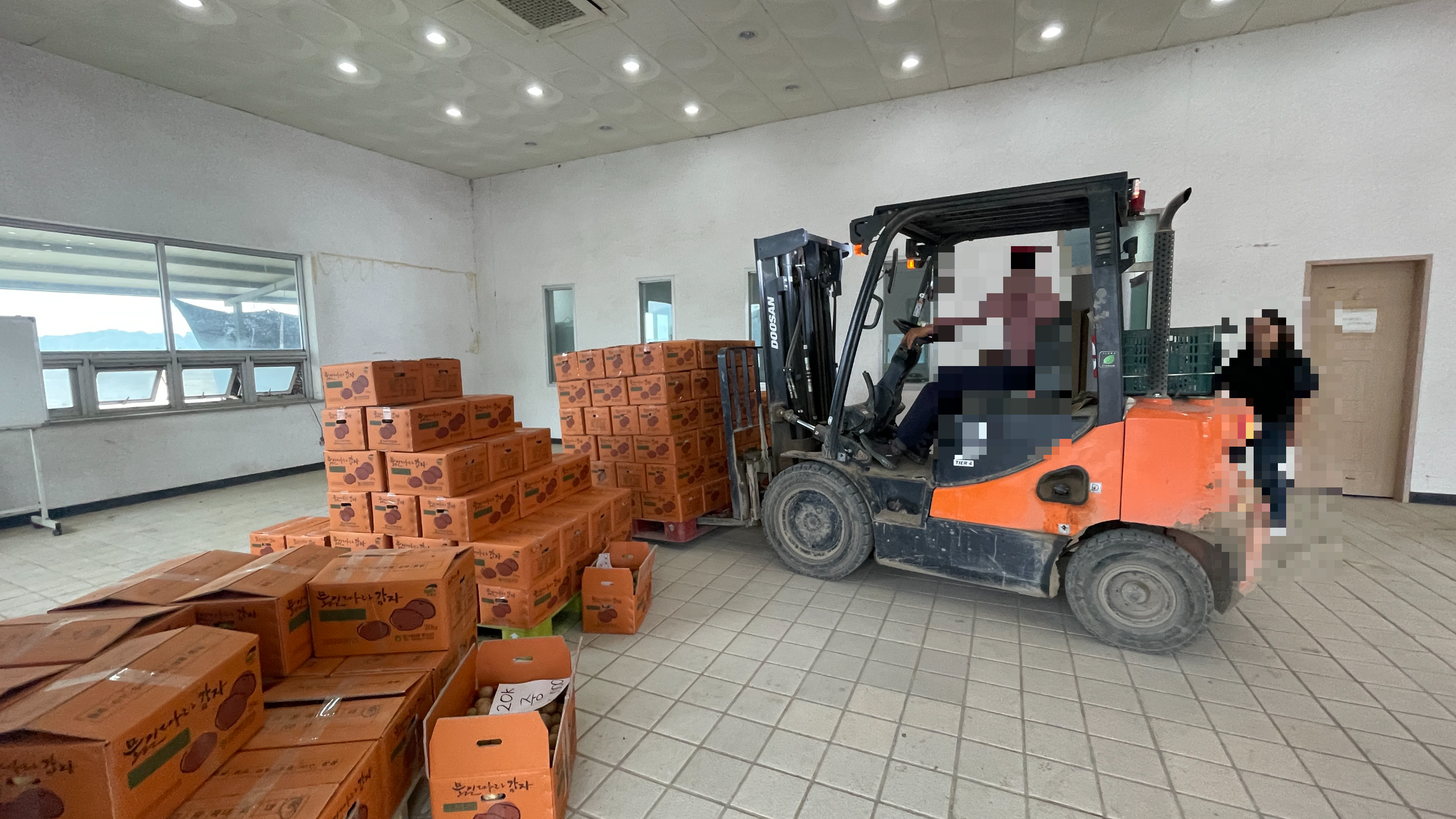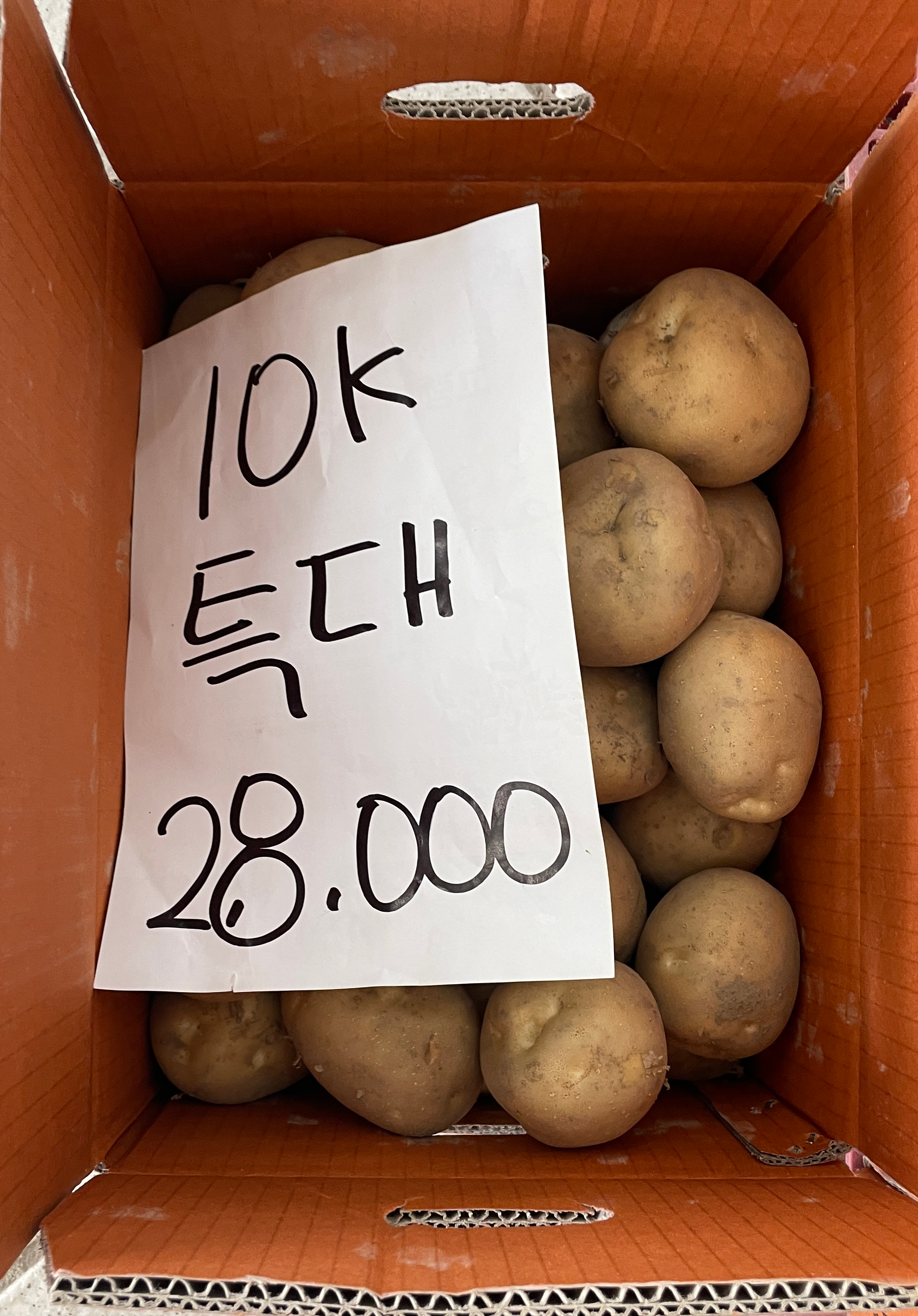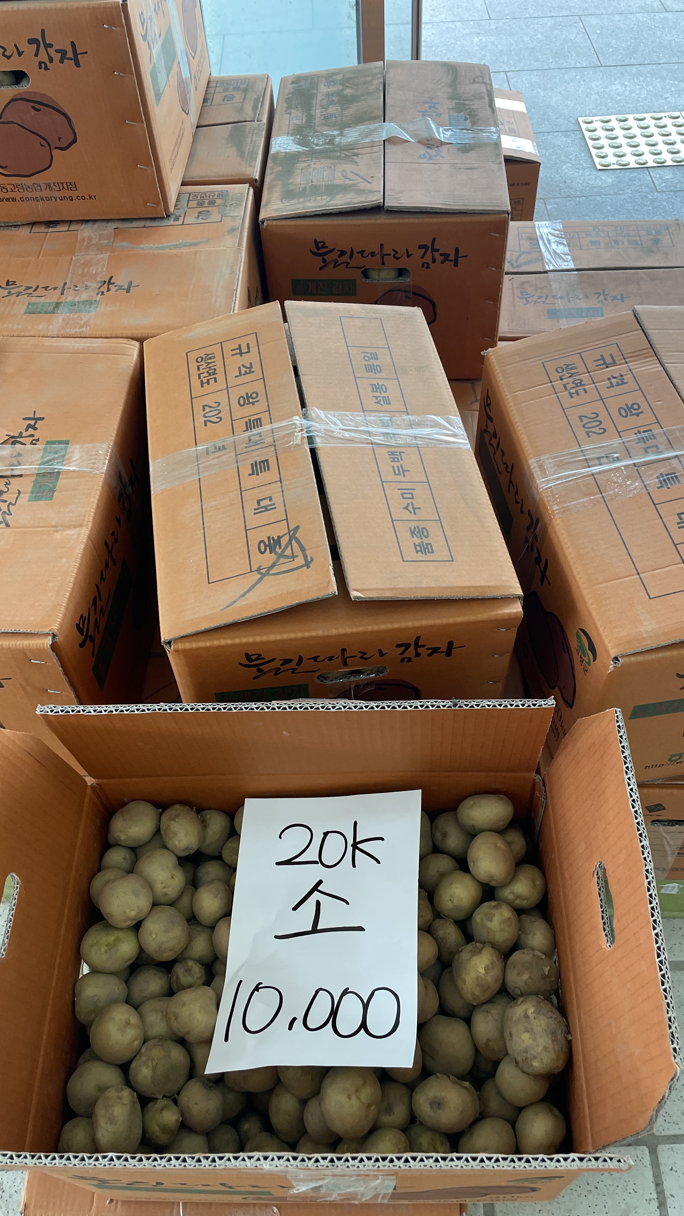 감자 크기별로 박스에 담겨져 있는데요 이 중에서 구매하고 싶은 크기를 선택한 다음 계산하고 자동차로 옮기면 됩니다. 옮기는 것도 개진감자직판장에서 도와주시니 어려움이 없습니다.