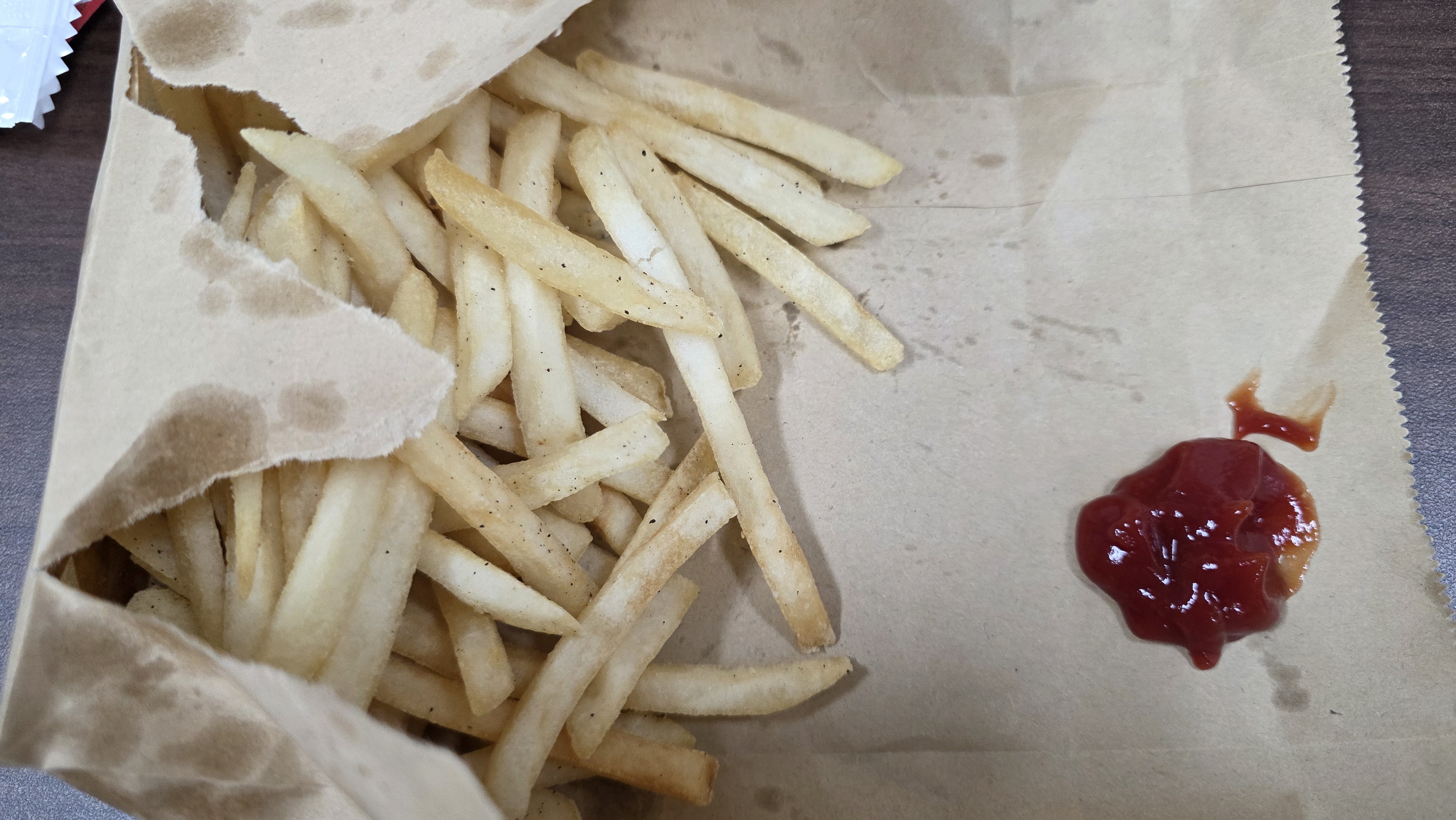 일단 감자튀김을 펼쳐놓고, 고이 접힌 어썸버거를 펼쳤습니다.