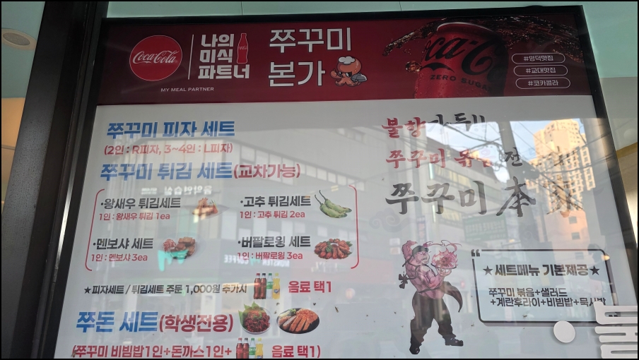 아~ 그리고 주위에 학교가 있어서 학생전용 메뉴가 있습니다. 쭈돈세트인데요 쭈꾸미비빔밥 1인 + 돈가스 1인 + 음료수 이렇게 해서 16,500원입니다. 학생들을 위한 사장님의 배려 같았습니다.