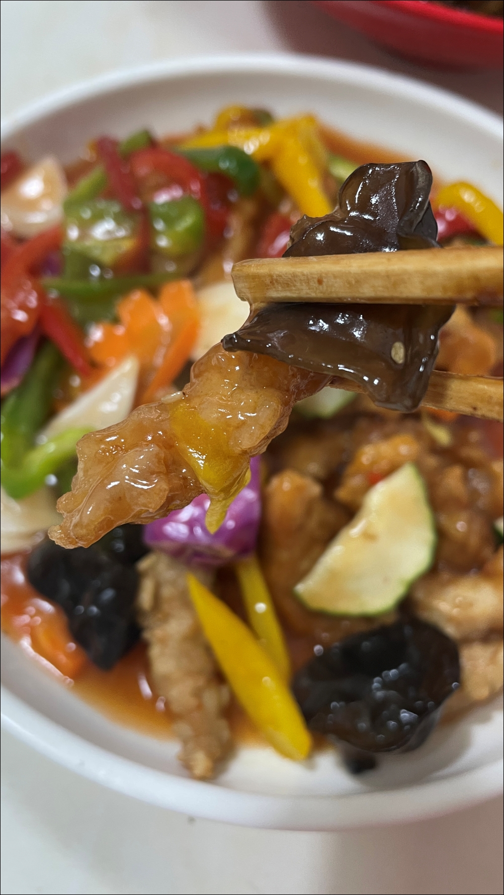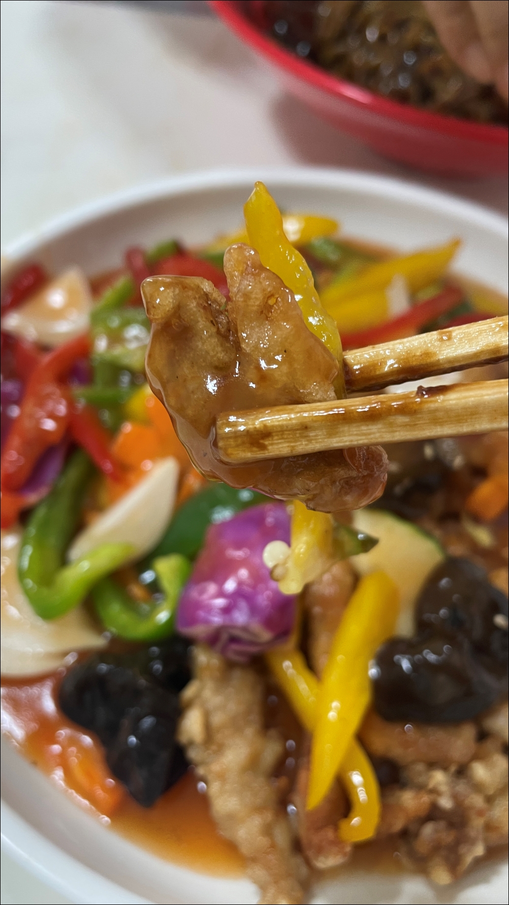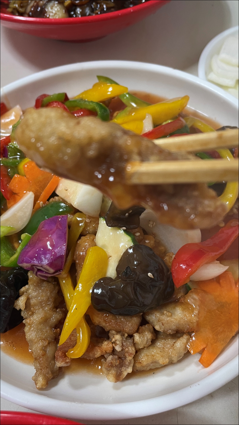 바삭하게 튀겨진 돼지고기와 제가 좋아하는 파프리카까지 듬뿍 들어간 탕수육이었습니다.