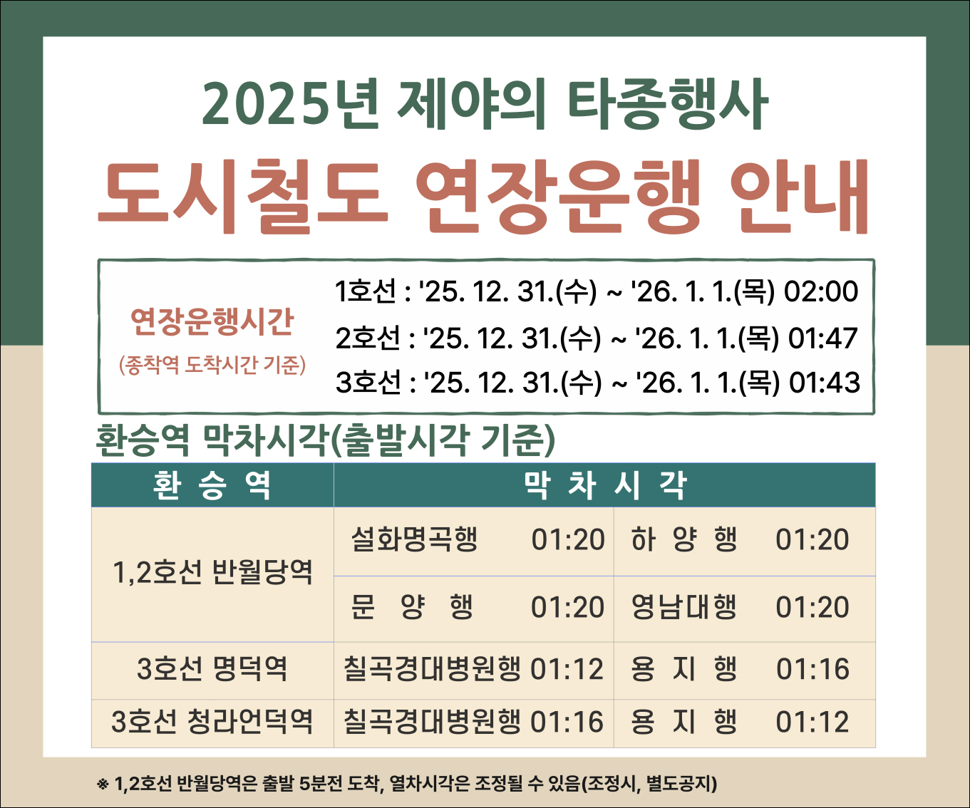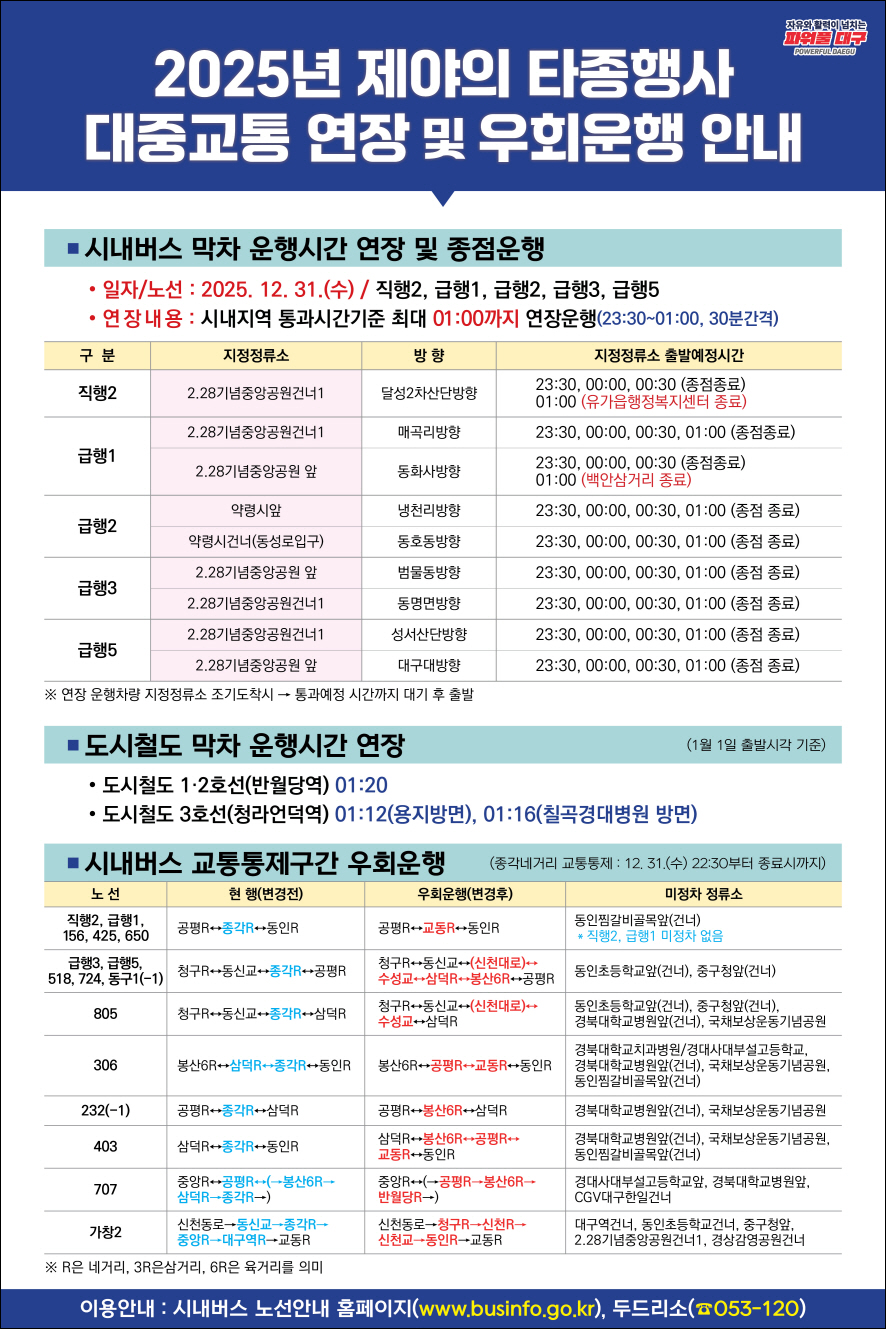 국채보상운동 기념공원에서 진행되는 제야의 종 타종행사에 참여하는 분들을 위해 18편(1,2,3 호선 상/하행 각 3회씩)이 증편됩니다.