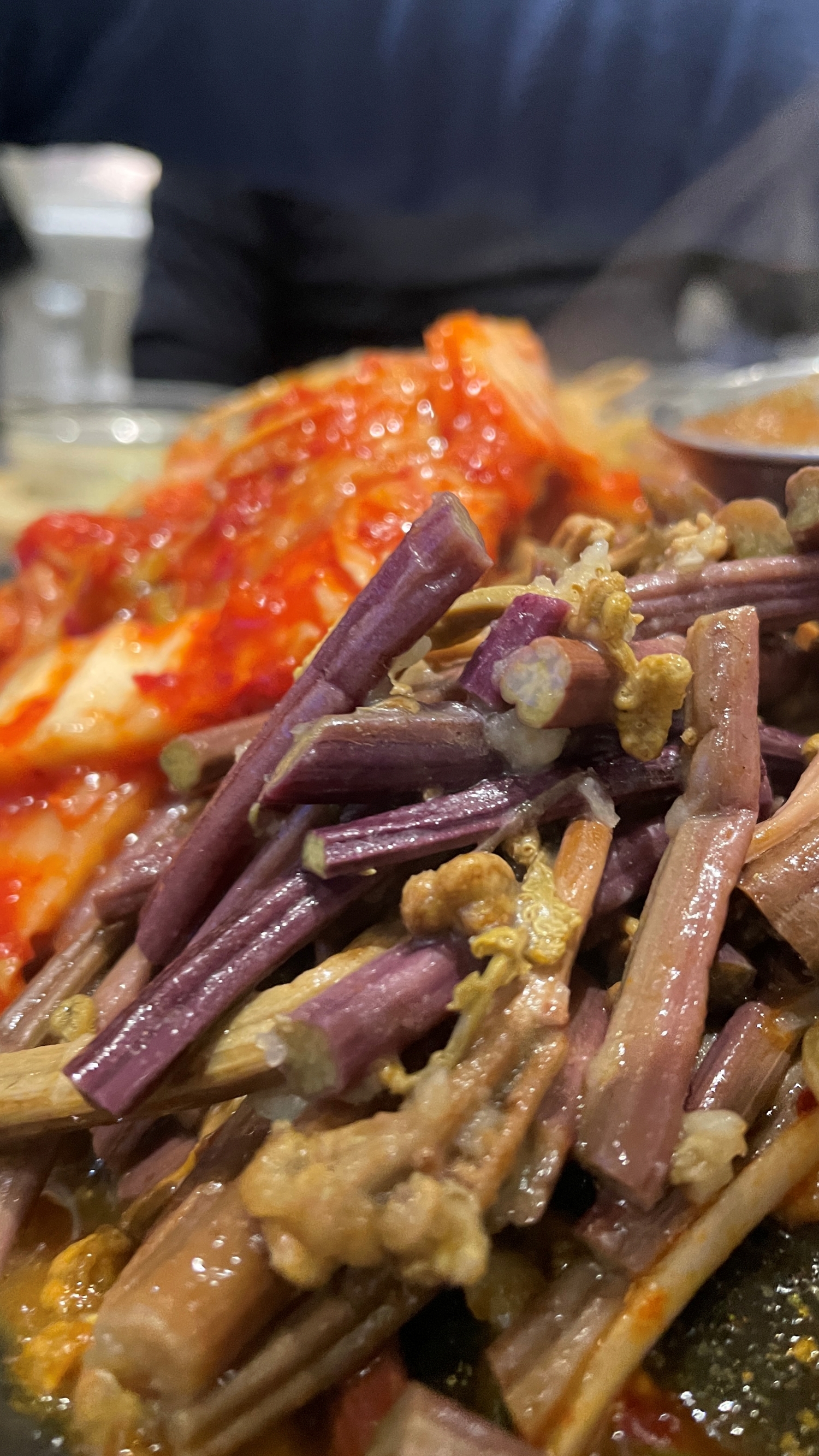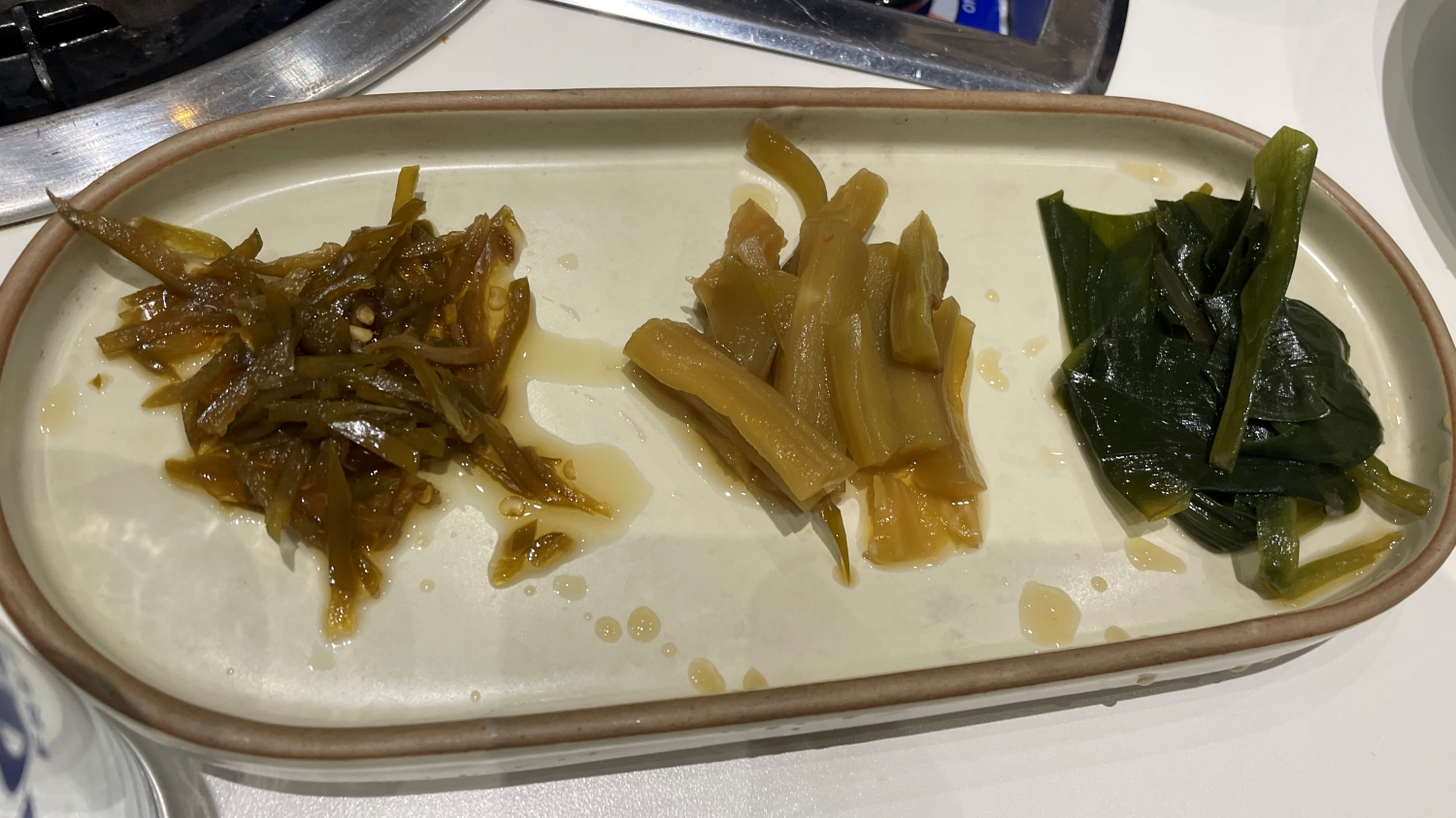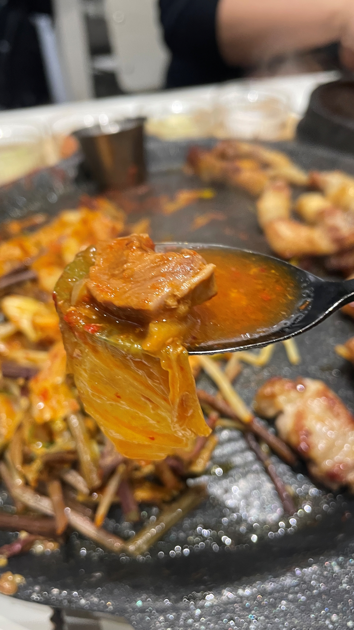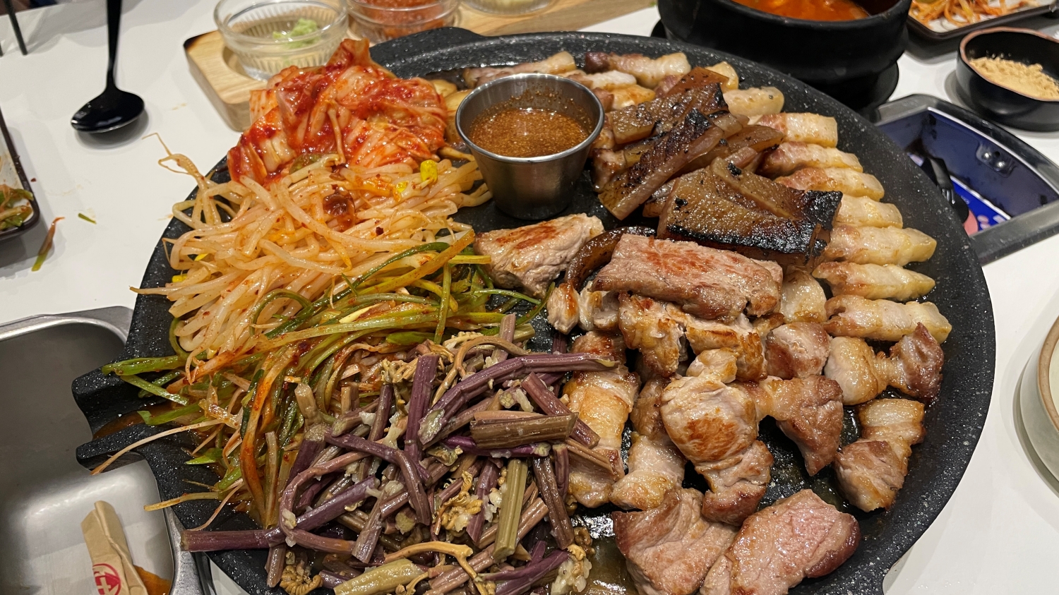 삼겹살, 목살 그리고 껍데기가 상단에 위치하고, 하단에는 김치, 콩나물, 파절이 및 고사리가 고기에서 흘러나오는 기름을 머금으면서 그 맛을 더해가는 중이었다.