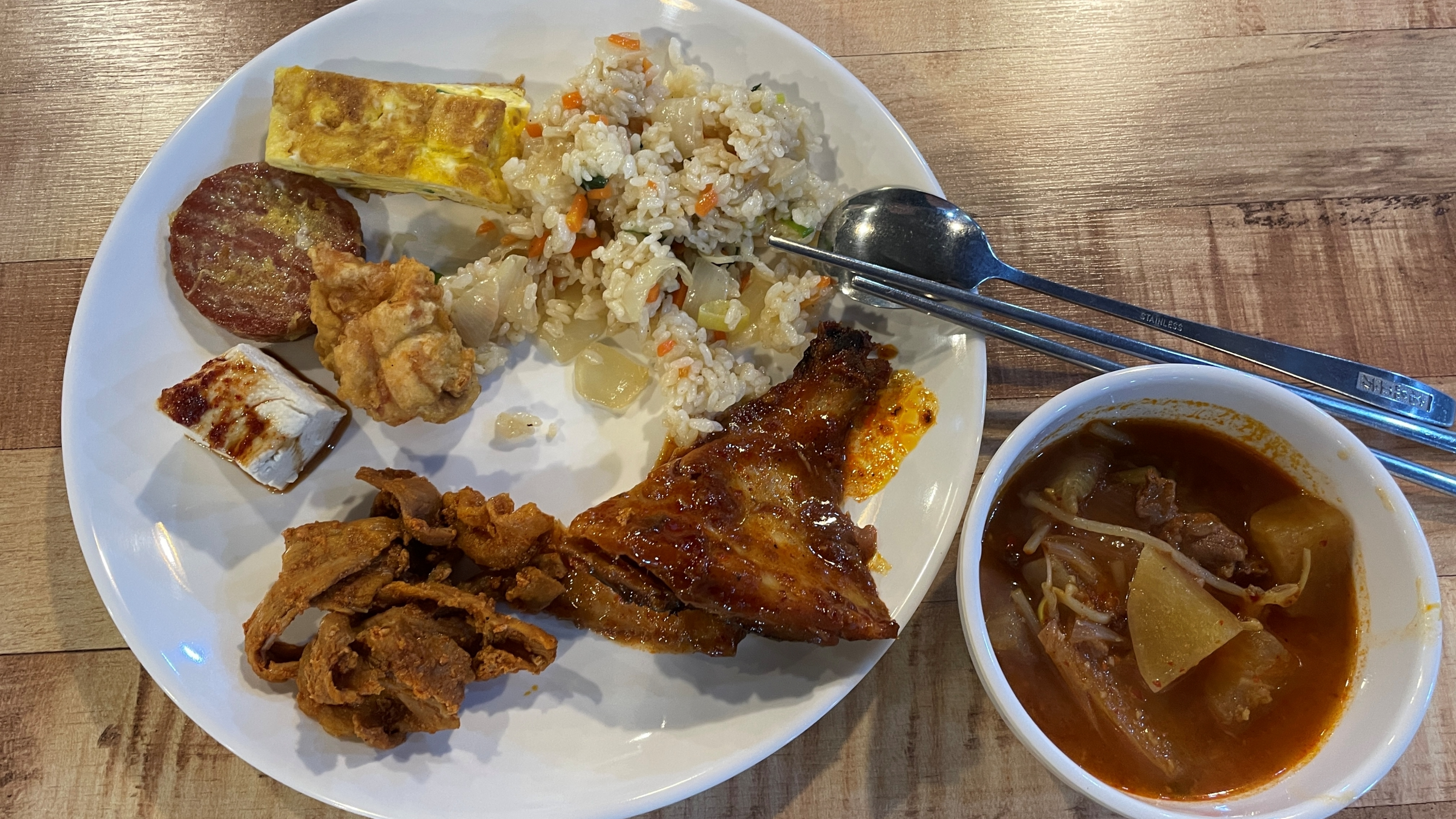 뷔페의 장점은 입맛에 맞는 음식을 골라 먹는 것인데, 큰형님한식뷔페도 그렇다. 가자미, 고기, 소시지, 계란말이, 볶음밥, 치킨, 두부를 담았다. 국은 소고기국, 미역국도 있었으나 그래도 소고기국이 좋다. 국은 고깃국. 하하하. 일단 먹어보고 입맛에 맞는지를 확인해야 한다.